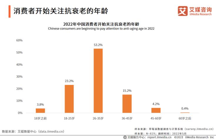 iiMedia Research(艾媒咨詢)數(shù)據(jù)顯示,53.2%的消費者在26-35歲時開始注重抗衰老,23.2%的消費者在18-25歲時開始注重抗衰老。艾媒咨詢分析師認為,隨著抗衰老行業(yè)的深入發(fā)展及抗衰老知識的普及應(yīng)用,關(guān)注抗衰老的人群越來越年輕化,消費抗衰老產(chǎn)品的群體將不斷擴大。