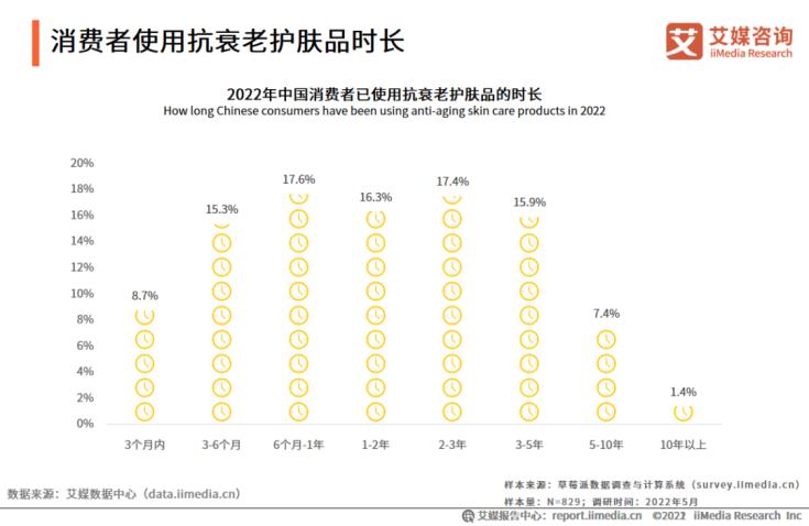 iiMedia Research(艾媒咨詢)數(shù)據(jù)顯示,使用抗衰老護膚品時長為6個月-1年的消費者數(shù)量最多,占比17.6%,其次是使用2-3年的消費者,占比17.4%,使用1-2年的消費者占比16.3%。艾媒咨詢分析師認為,五成以上消費者使用抗衰老護膚品的時長為6個月-3年,大部分消費者在近三年里使用抗衰老護膚品,抗衰老護膚品要持續(xù)迭代升級抗衰成分的有效性,以贏得更多消費者的認可。