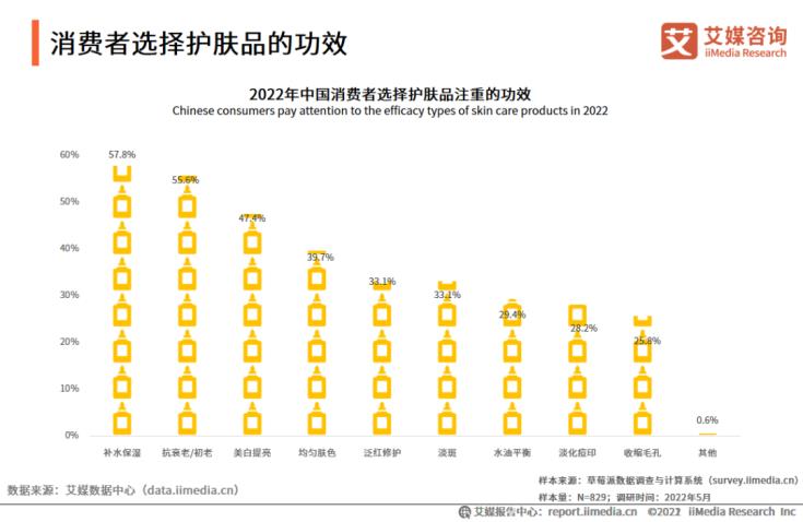 iiMedia Research(艾媒咨詢)數(shù)據(jù)顯示,消費者選擇護膚品時最注重補水保濕的功效,占比57.8%,其次是抗衰老功效,占比55.6%。艾媒咨詢分析師認為,消費者在選擇護膚品時,抗衰老需求較高,未來抗衰老護膚品行業(yè)發(fā)展前景明朗。