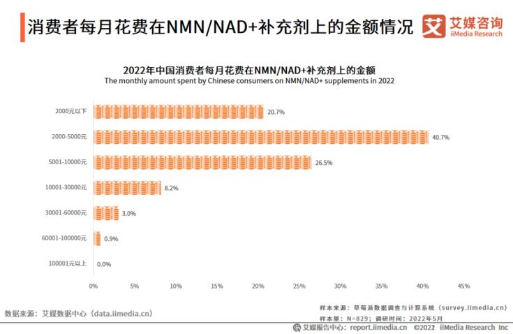 iiMedia Research(艾媒咨詢)數(shù)據(jù)顯示,40.7%的消費者每月花費在NMN/NAD+補充劑上的金額為2000-5000元,26.5%的消費者花費5001-10000元。艾媒咨詢分析師認為,NMN/NAD+補充劑的價格相對昂貴,但仍有近七成消費者花費在NMN/NAD+補充劑上的金額在2000-10000元區(qū)間,消費者逐漸提高對NMN/NAD+補充劑的認可度。