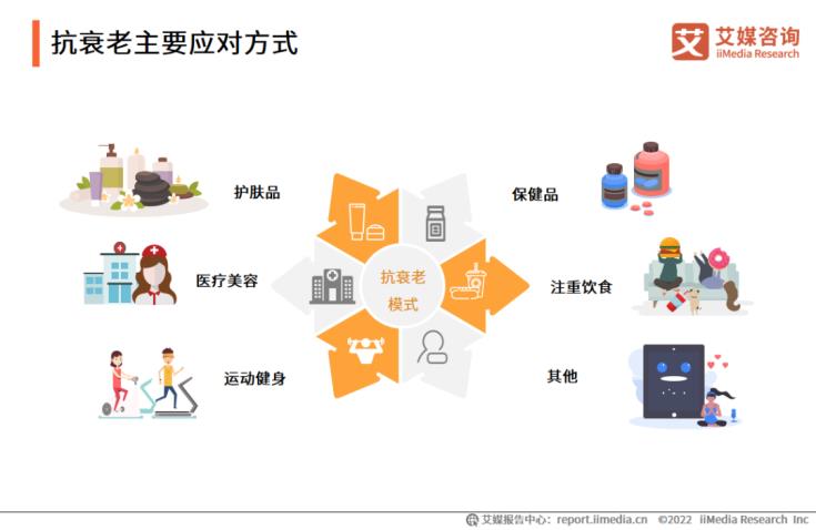 實際年齡上的衰老是由時間來衡量,生理年齡上的衰老則與體型外貌有關(guān)。目前在應(yīng)對衰老方面已經(jīng)不再一味地追求延長預(yù)期壽命,而是追求健康養(yǎng)生的生活方式,使用抗衰護膚品或進行醫(yī)美來維持年輕的樣貌,或食用抗衰保健品、運動健身等方式來增強自身生理功能。
