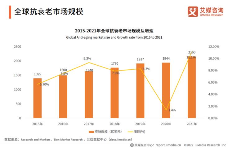 隨著全球人口老齡化的持續(xù)深化,“健康衰老”逐步發(fā)展成為新的消費市場。iiMedia Research(艾媒咨詢)數(shù)據(jù)顯示,2021年全球抗衰老市場規(guī)模為2160億美元,同比增速達11.1%。特別在中國消費升級、健康需求深化的情況下,中國延緩衰老的需求日益增長,抗衰老行業(yè)持續(xù)擴容。