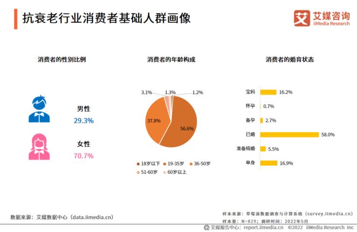 iiMedia Research(艾媒咨詢)數(shù)據(jù)顯示,購買抗衰老產(chǎn)品的消費者中女性占70.7%,男性占29.3%,56.6%的消費者年齡為19-35歲,37.8%消費者年齡為36-50歲。其中,58.0%的受訪消費者已婚,16.9%處于單身狀態(tài)。艾媒咨詢分析師認為,隨著人們的抗衰老意識逐漸深化,延緩衰老的需求日益增長,且消費抗衰老產(chǎn)品的大部分為女性群體,抗衰老行業(yè)面向女性消費者存在廣闊的發(fā)展空間。
