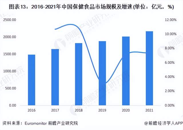 保健食品大致可劃分為維生素和膳食補充劑、體重管理和運動營養(yǎng)三大領(lǐng)域。根據(jù)Euromonitor統(tǒng)計的數(shù)據(jù),2016-2021年中國保健食品市場規(guī)模呈現(xiàn)逐年上升的趨勢,2021年市場規(guī)模為2167.65億元,同比增長7.39%。