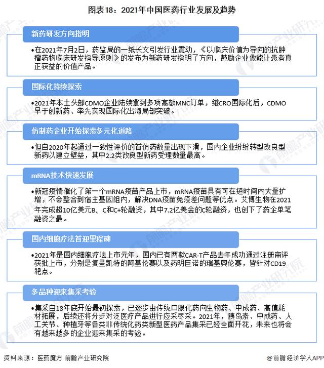 2021年,我國醫(yī)藥行業(yè)整體呈現(xiàn)出國際化持續(xù)探索、新藥研發(fā)方向明確、仿制藥企業(yè)多元探索、mRNA技術(shù)發(fā)展、細胞療法迎里程碑等多維度發(fā)展趨勢:
