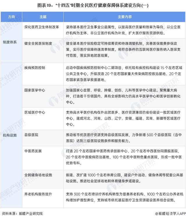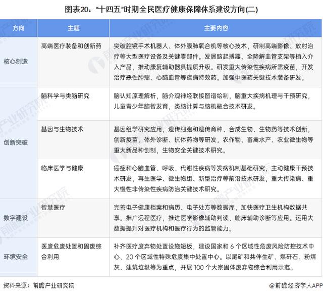 《中華人民共和國國民經(jīng)濟和社會發(fā)展第十四個五年規(guī)劃和2035年遠景目標綱要》從制度體系、機構(gòu)設(shè)施、核心制造、創(chuàng)新突破、數(shù)字建設(shè)、環(huán)境安全6大方向出發(fā),豐富了我國全民醫(yī)療健康體系建設(shè)的內(nèi)涵。人民健康上升到戰(zhàn)略高度,我國大健康行業(yè)將迎來全方位發(fā)展。