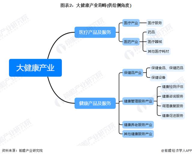 從產(chǎn)品及服務(wù)性質(zhì)可分為醫(yī)療產(chǎn)品及服務(wù)和健康產(chǎn)品及服務(wù),醫(yī)療產(chǎn)品及服務(wù)主要有:以醫(yī)療服務(wù)機構(gòu)為主體的醫(yī)療產(chǎn)業(yè)和以藥品、醫(yī)療器械以及其他醫(yī)療耗材產(chǎn)銷為主體的醫(yī)藥產(chǎn)業(yè);健康產(chǎn)品及服務(wù)主要有:以保健食品、健康產(chǎn)品產(chǎn)銷為主體的保健品產(chǎn)業(yè);以個性化健康檢測評估、咨詢服務(wù)、調(diào)理康復(fù)、保障促進等為主體的健康管理服務(wù)產(chǎn)業(yè);以居家為基礎(chǔ)、社區(qū)為依托、機構(gòu)為支撐健康養(yǎng)老服務(wù)產(chǎn)業(yè)。