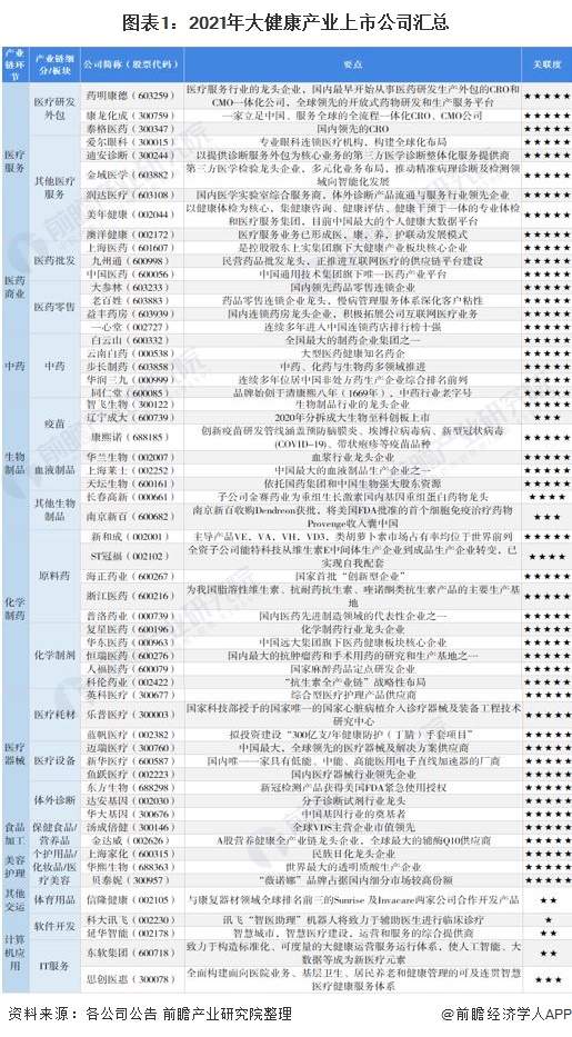 黨的十九屆五中全會提出“全面推進健康中國建設(shè)”,明確了2035年建成健康中國的遠景目標?!笆奈濉币?guī)劃和2035年遠景目標綱要進一步細化了“十四五”時期全面推進健康中國建設(shè)的目標任務(wù)。目前,我國大健康產(chǎn)業(yè)的上市公司數(shù)量較多,分布在各產(chǎn)業(yè)鏈環(huán)節(jié)。其中,涉及醫(yī)療服務(wù)、醫(yī)藥商業(yè)、醫(yī)藥制造的上市公司包括:藥明康德、愛爾眼科、九州通、老百姓、白云山等。