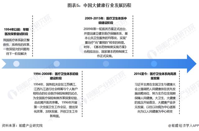 1994年之前,我國醫(yī)療行業(yè)改革仍處于探索階段,伴隨著醫(yī)療機構(gòu)市場化的是與非的爭議,各項探索性改革進行,但總體仍缺乏整體性,系統(tǒng)性的改革,一些深層次的問題尚未解決。1994年,國務(wù)院決定在江蘇鎮(zhèn)江、江西九江進行社會統(tǒng)籌與個人賬戶相結(jié)合的社會醫(yī)療保險制度的試點,為全國醫(yī)療保險制度改革探索經(jīng)驗,由此揭開醫(yī)改序幕。1996年開展第一次全國衛(wèi)生工作會議,提出深化改革,加快發(fā)展,開創(chuàng)衛(wèi)生工作新局面。2009年新一輪醫(yī)改方案正式出臺,并提出建立健全醫(yī)療保障體系,基本公共衛(wèi)生服務(wù)的均等化,實現(xiàn)"重治療"向"重預(yù)防"轉(zhuǎn)變的前提。時年,《基本藥物制度實施方案》也相應(yīng)出臺,國家基本藥物制度工作正式實施。由此,我國醫(yī)療衛(wèi)生體系公平性和可及性加速提升。2016年習近平主席在全國衛(wèi)生與健康大會上強調(diào)把人民健康放在優(yōu)先發(fā)展戰(zhàn)略地位,努力全方位全周期保障人民健康。大衛(wèi)生、大健康的觀念開始普及,以往以治病為中心逐漸向為以人民健康為中心轉(zhuǎn)變,此后,中央和地方政府繼續(xù)出臺政策促進大健康產(chǎn)業(yè)多元發(fā)展。隨著我國社會經(jīng)濟的發(fā)展,人民的深層次健康意識覺醒,人民對健康這一概念有了更高質(zhì)量的理解和追求。