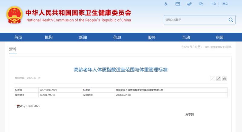 近日,國家衛(wèi)健委發(fā)布了行業(yè)標(biāo)準(zhǔn)《高齡老年人體質(zhì)指數(shù)適宜范圍與體重管理標(biāo)準(zhǔn)》,從體質(zhì)指數(shù)指標(biāo)策略以及體重管理兩大方面的七項細(xì)則出發(fā),為高齡老人的體重管理提出了具備參考性的行業(yè)標(biāo)準(zhǔn)。