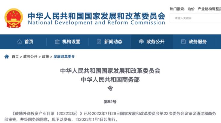 10月28日,經(jīng)國(guó)務(wù)院同意,國(guó)家發(fā)展改革委、商務(wù)部公開發(fā)布第52號(hào)令,全文發(fā)布《鼓勵(lì)外商投資產(chǎn)業(yè)目錄(2022年版)》(以下簡(jiǎn)稱《鼓勵(lì)目錄》),自2023年1月1日起施行。